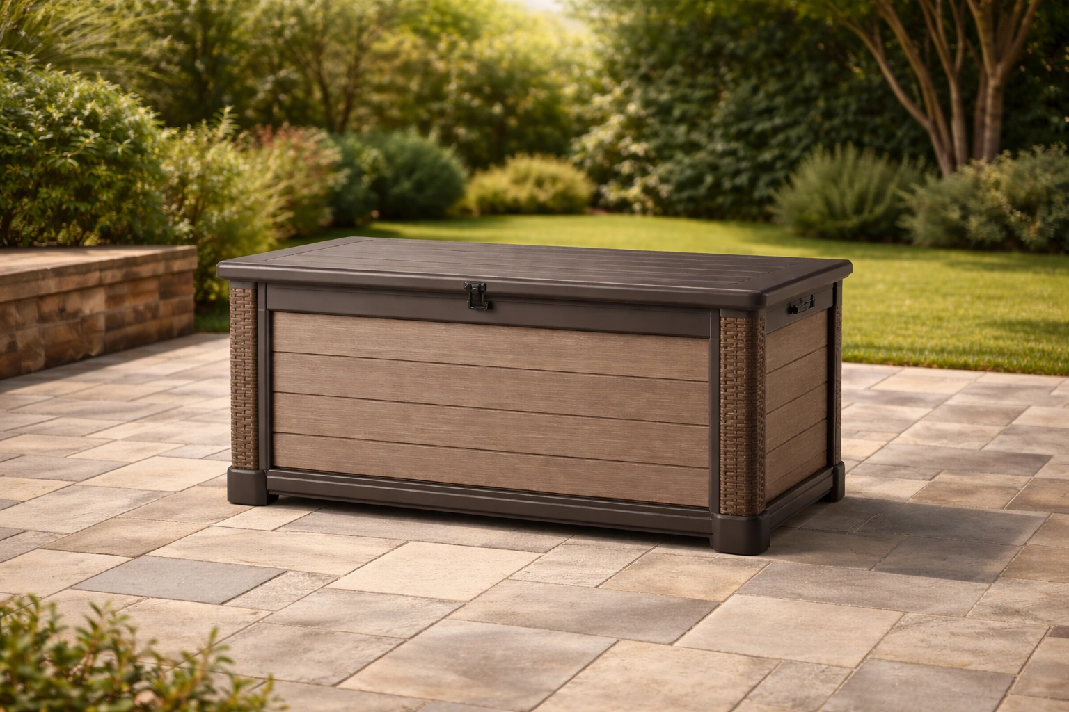 Caja de herramientas de plástico rojo y negro con cierres metálicos